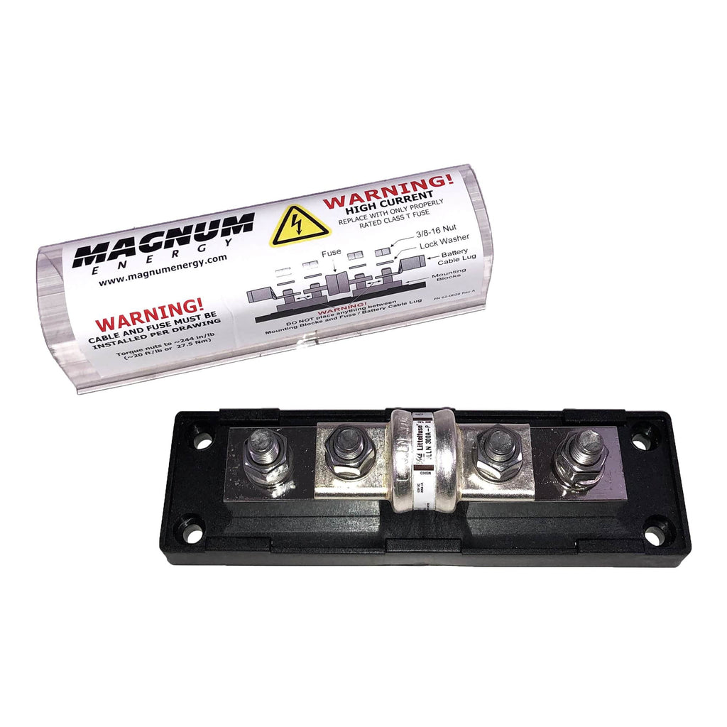 Magnum ME-300F 300 Amp Fuse. Complete kit in one package Magnum Energy Energy fuses include a Slow-Blow high current fuse a mounting block and protective cover. Magnum Energy Energy Fuse Block assemblies are designed to provide code compliant over-current protection. They are used to protect the battery bank inverter and cables from damage caused by short circuits and overloads.