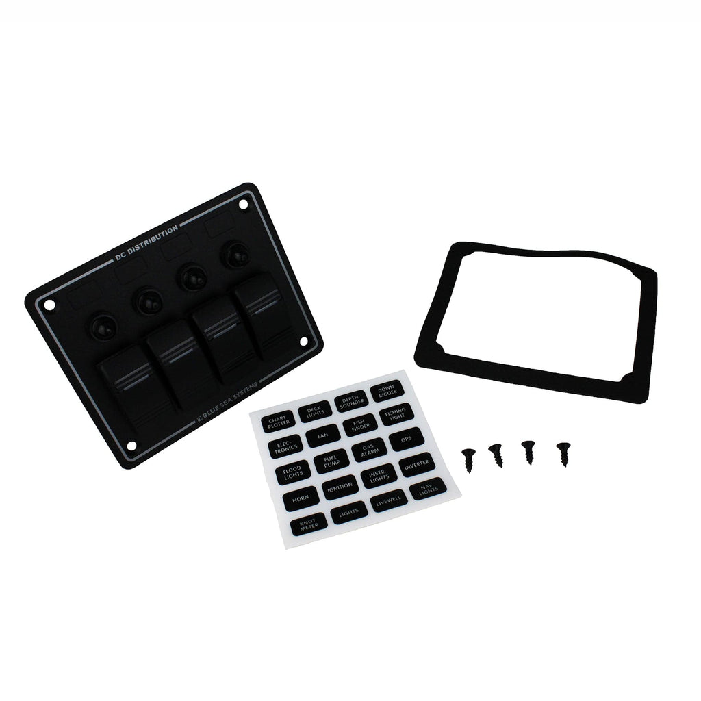 This is a black 12/24V DC 4 position water resistant circuit breaker panel