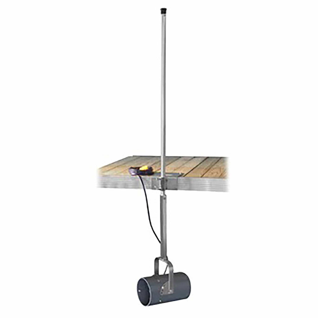 A heavy-duty, stainless steel dock plate, pipe, and yoke assembly suspend the Scott Aerator Dock-Mount De-Icer under the waters surface.