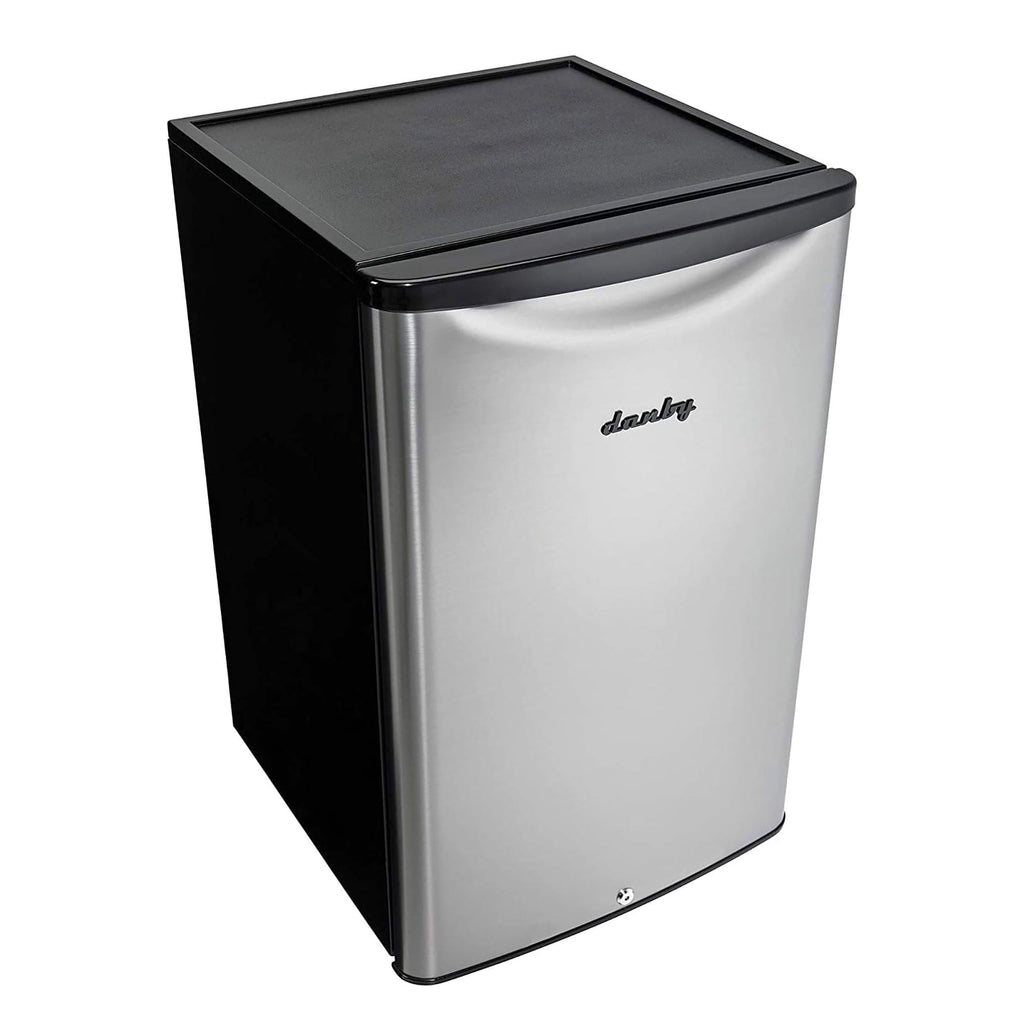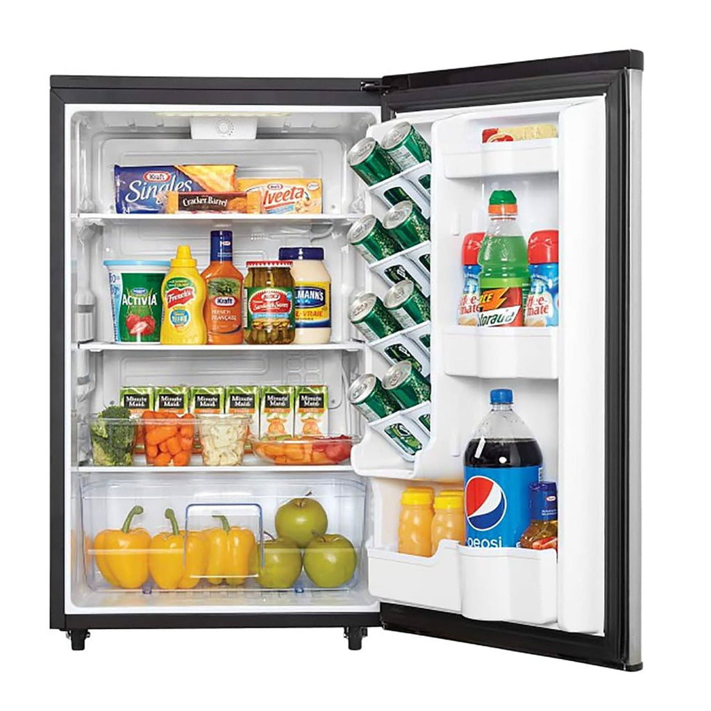 Presenting the Danby 4.4 CF 1-Door Outdoor All Refrigerator, crafted with a durable black cabinet and a spotless steel door, perfect for outdoor settings. This Energy Star certified refrigerator features auto-defrost technology for hassle-free maintenance and efficient cooling performance in varying outdoor conditions. With its spacious interior and robust design, it offers ample storage capacity and durability, ideal for enhancing outdoor living spaces with both style and reliability.