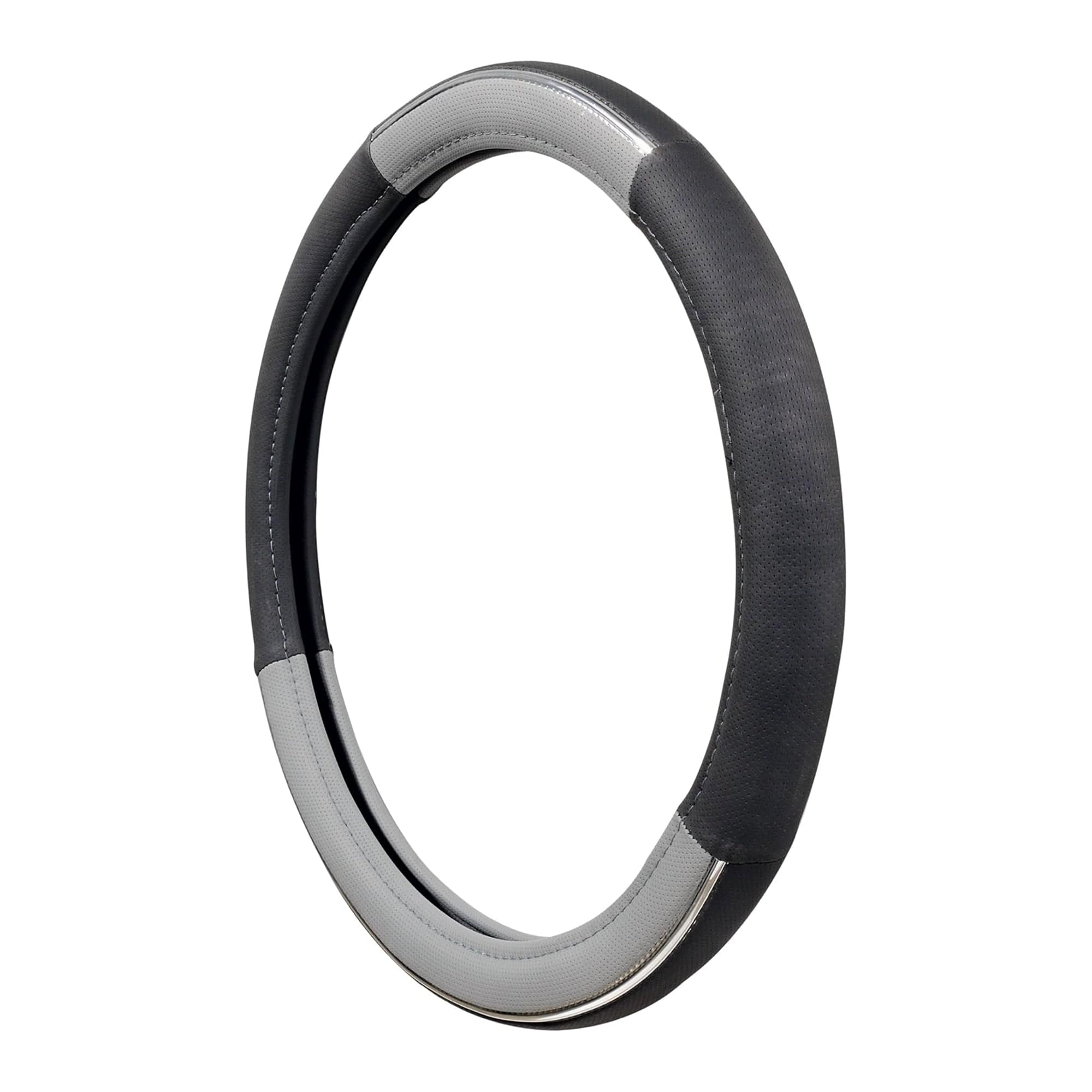 Elevate your vehicle's interior with the Silver Trim Steering Wheel Cover in Gray by Allison Corp (92-6367). This stylish cover features a sleek silver trim that adds a touch of sophistication while providing a comfortable grip. The gray design complements various interiors, offering both an upscale look and enhanced driving comfort.