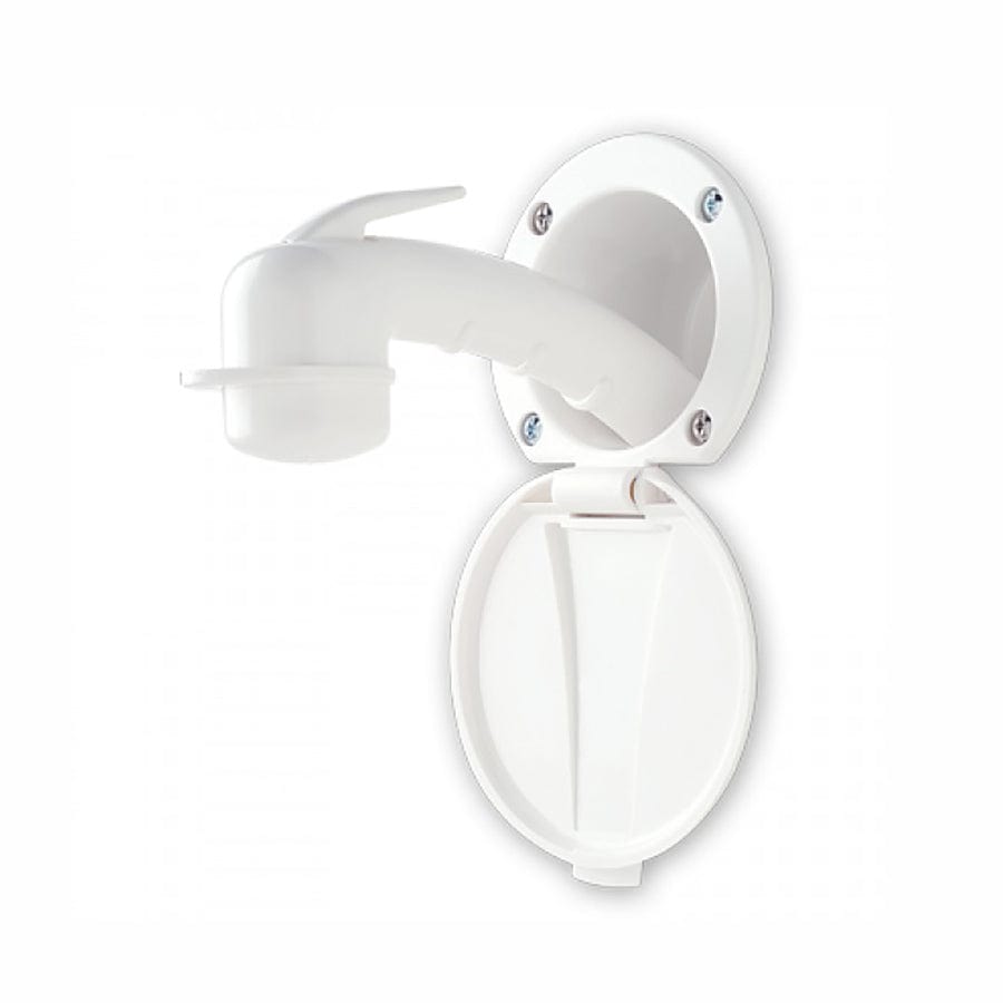 This is a white, plastic recessed shower with lid, marine sprayer, plastic cup, and 6-foot hose. It features wall or deck mounting options, single-hole mount, and intermittent / continuous flow trigger control.