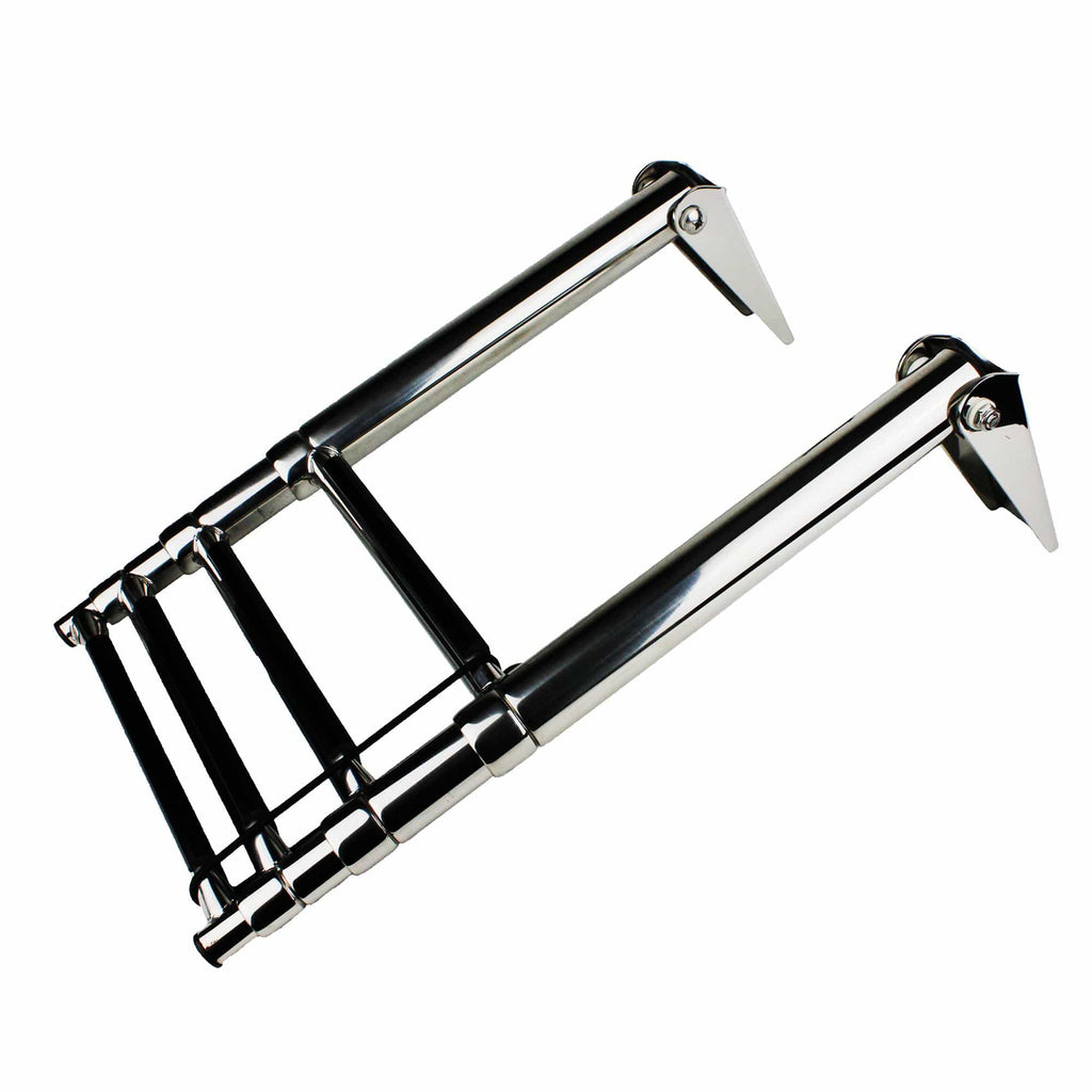 This is an over-platform telescoping drop ladder which has 4 steps that fold out and over, telescoping down easily. Featuring Compact stowage, the ladder steps fold over flat on platform. It has flat poly treads for increased comfort. Manufactured from 304 Stainless Steel. Rated to 400 lbs.