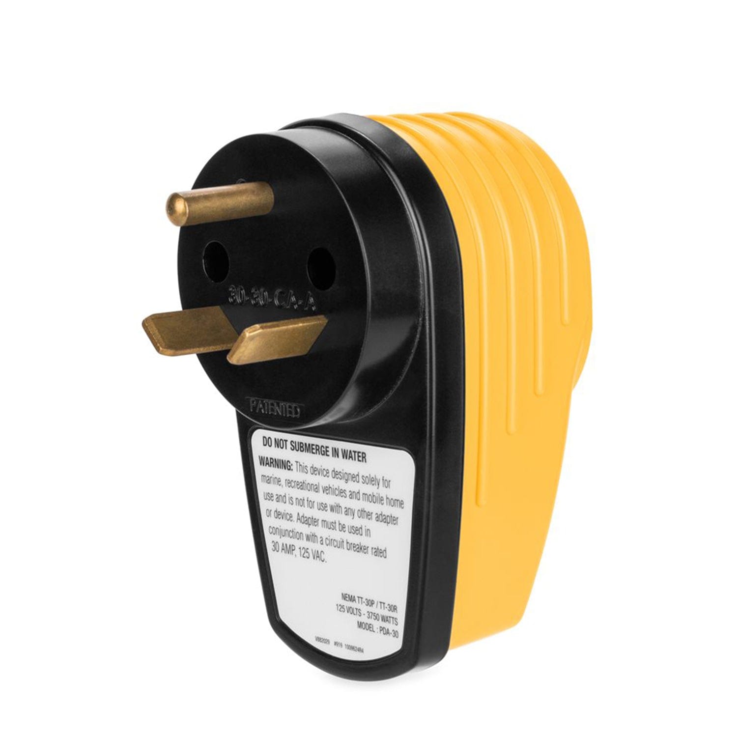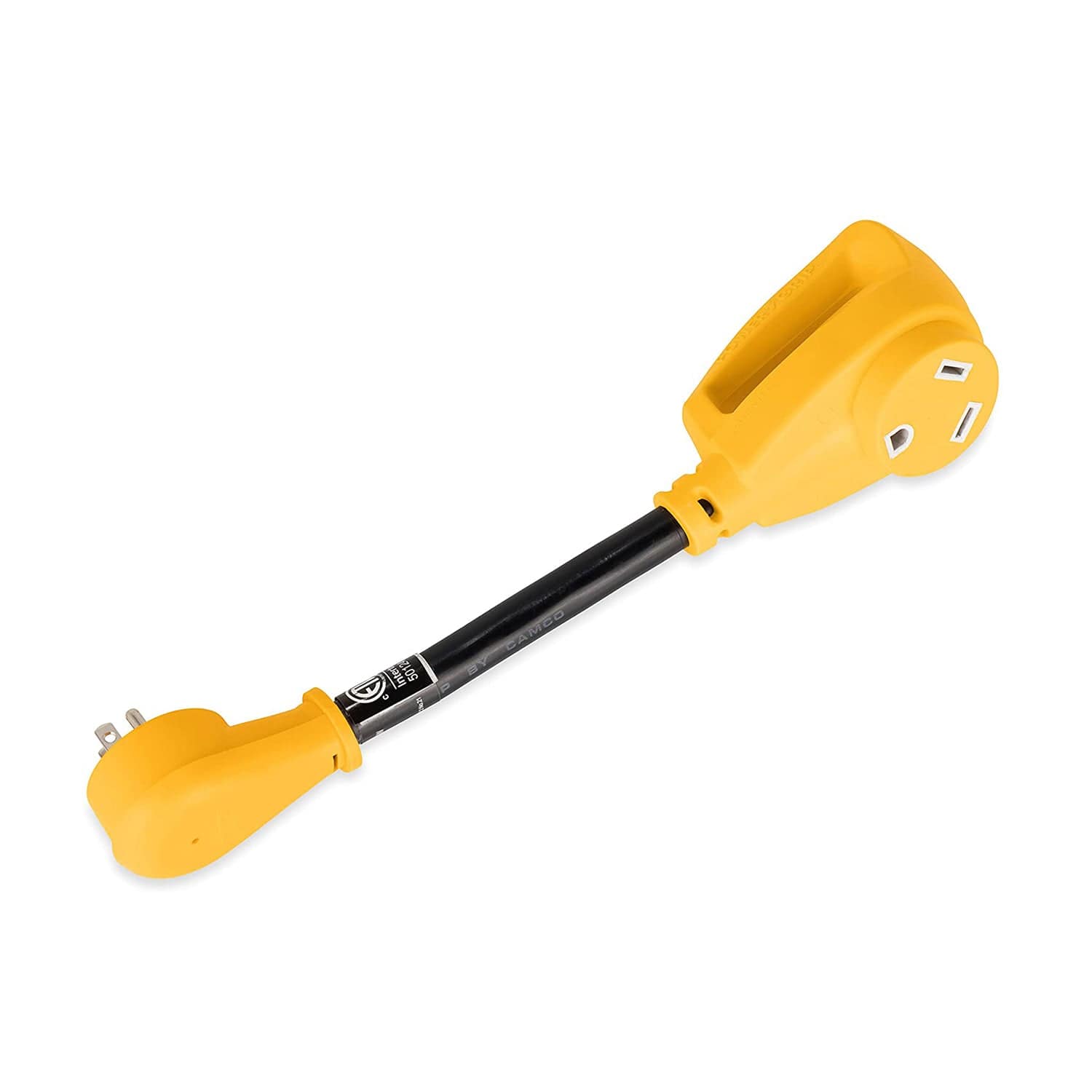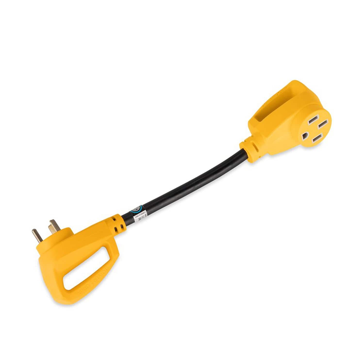 • High Conductivity: Heavy-duty 30-amp male (NEMA TT-30P) and 50-amp female (NEMA 14-50R) electrical heads. Rated for 125 volts/3750 watts. Constructed with 100% copper, 10/3-gauge wires for superior conductivity.