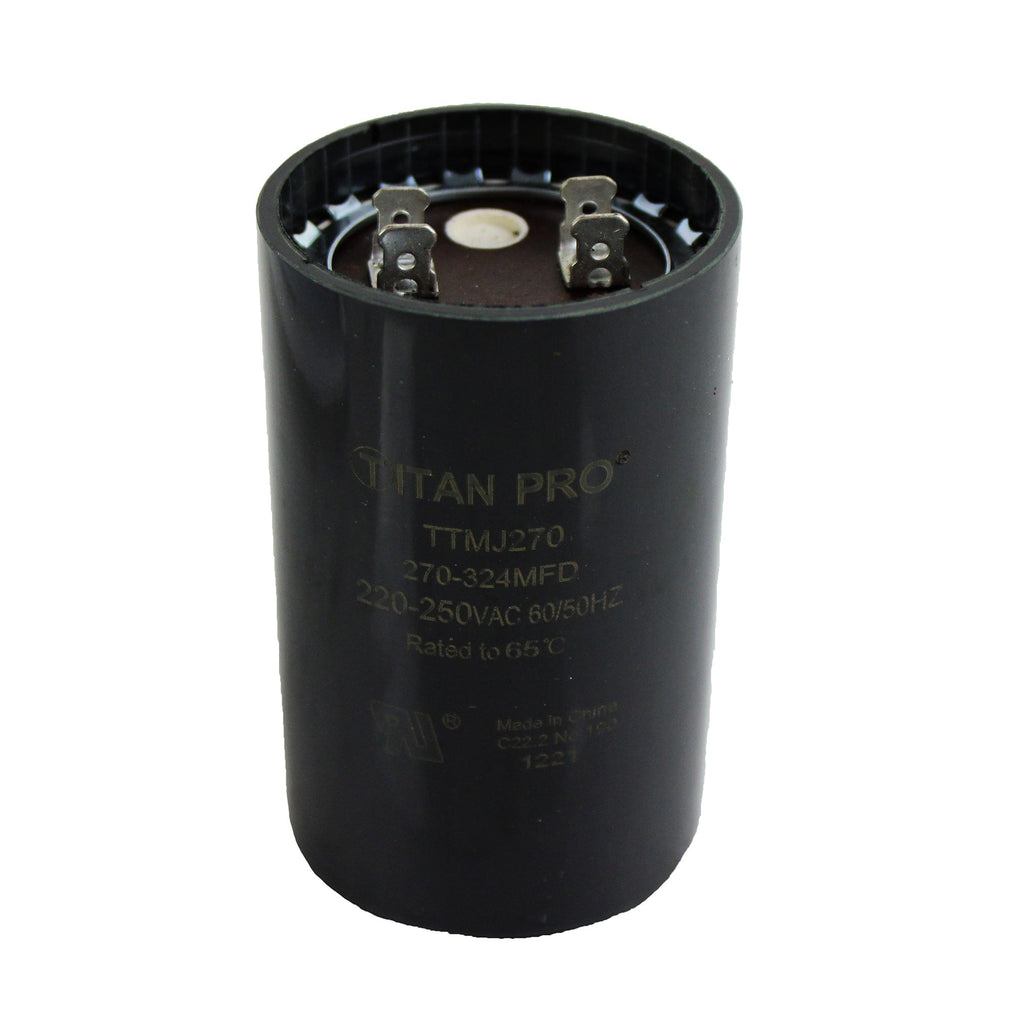 This is a Titan Pro motor start capacitor 220-250V, 270-324 MFD from Packard. These are dry, electrolytic, non-polarized for intermittent duty in AC motor starting circuits. The round cases are made of moisture and oil resistant molded phenolic resin or plastic. Featuring standard dual blade terminals.