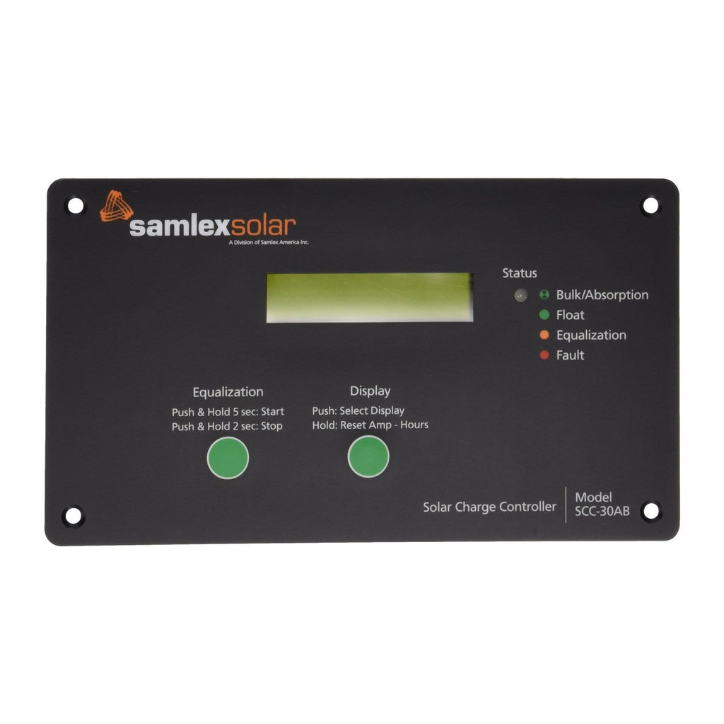 SAMLEX SCC-30AB 12 / 24 VOLT 30 AMP PULSE WIDTH MODULATION ( PWM ) SOLAR CHARGE CONTROLLER WITH LCD DISPLAY. The Samlex SCC-30AB 30 Amp PWM Charge Controller regulates current and protects your batteries from over-charging. Features of this 4-stage Charger include: LED status indicators, digital LCD monitor and 8 charge settings for most battery types. Charging is further regulated with the optional DC-BTS-A-C Battery Temperature Sensor. Additional featues of this unit include dual voltage capability- can be used with 12 or 24 volt systems and the 30 amp charging capacity-enables use of up to 360 watts of 12 volts or 720 watts of 24 volts.