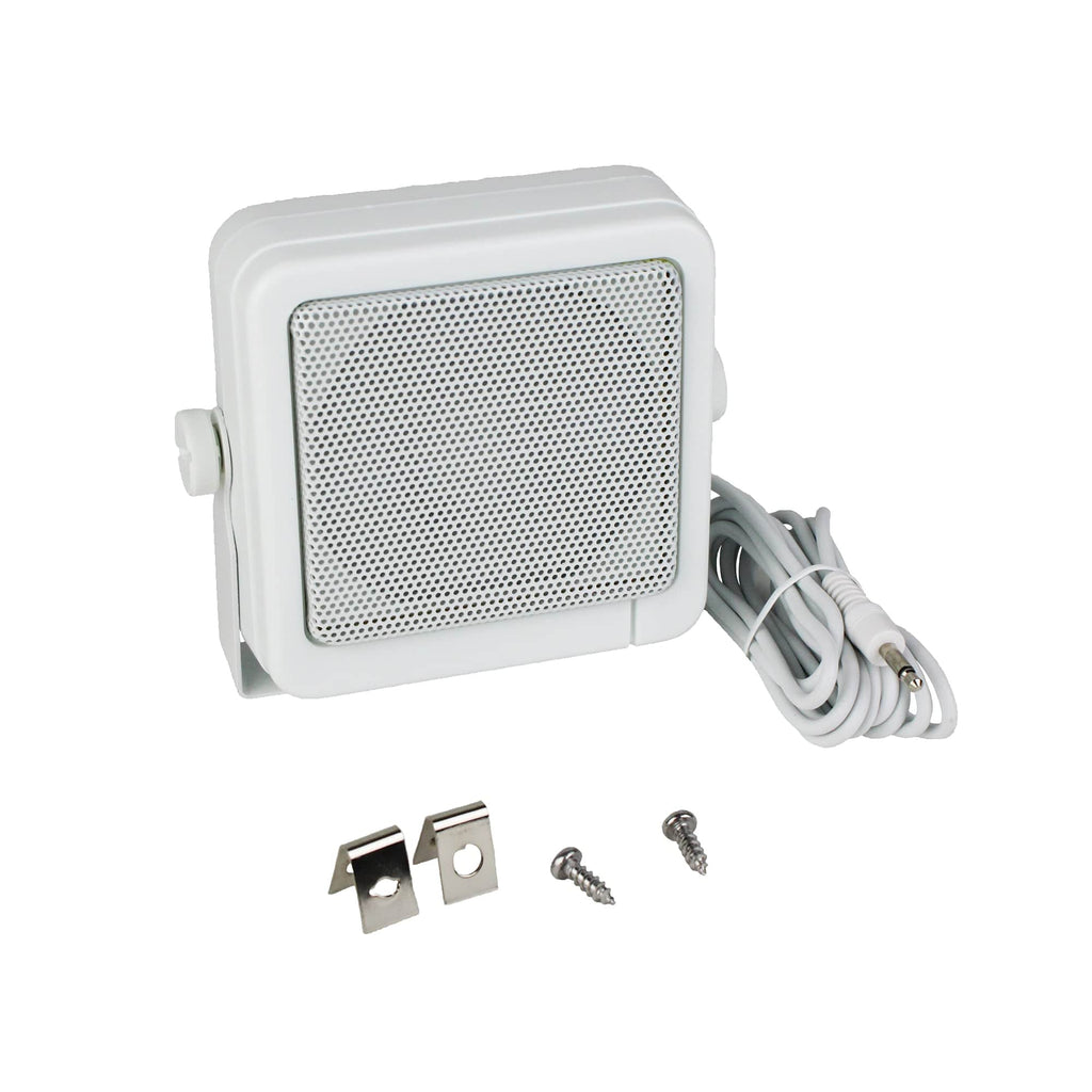 This is a 4″, 4-ohm, deluxe speaker with Mylar cone and white plastic cabinet to protect from damage against moisture. Maximum input power is 8 watts (RMS). Most VHF radios provide external audio outputs. These accessory speakers are color and performance matched to make installation a breeze.