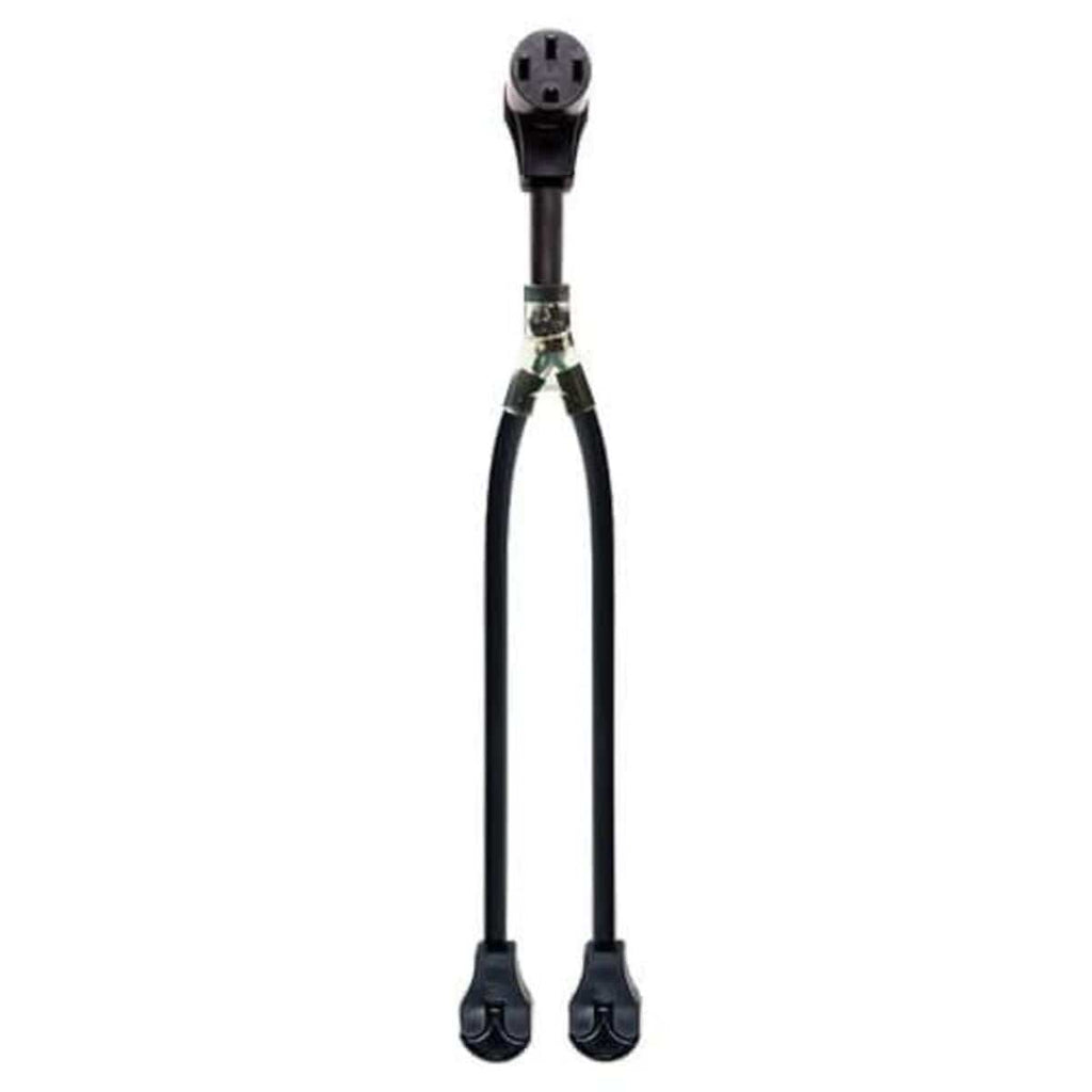 The Amp-Up! RV Y-Adapter plugs into a 30A outlet on separate circuits to provide a 240V/50A service outlet, enabling RVs with 50A service to have full use of air conditioners and appliances when only 30A service is available. Indicator lights are provided for each 30A plug when power is applied. Allow full use of RV appliances. Easy-T-Pull handles.