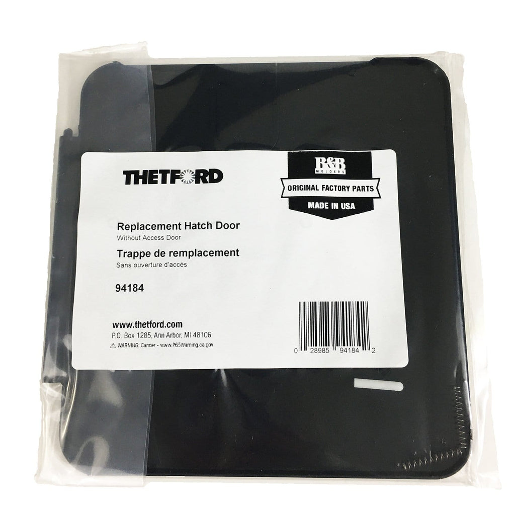 The 94184 is a Thetford black replacement hatch door without an access door for a 6.5" x 8" BandB Molder hatch.