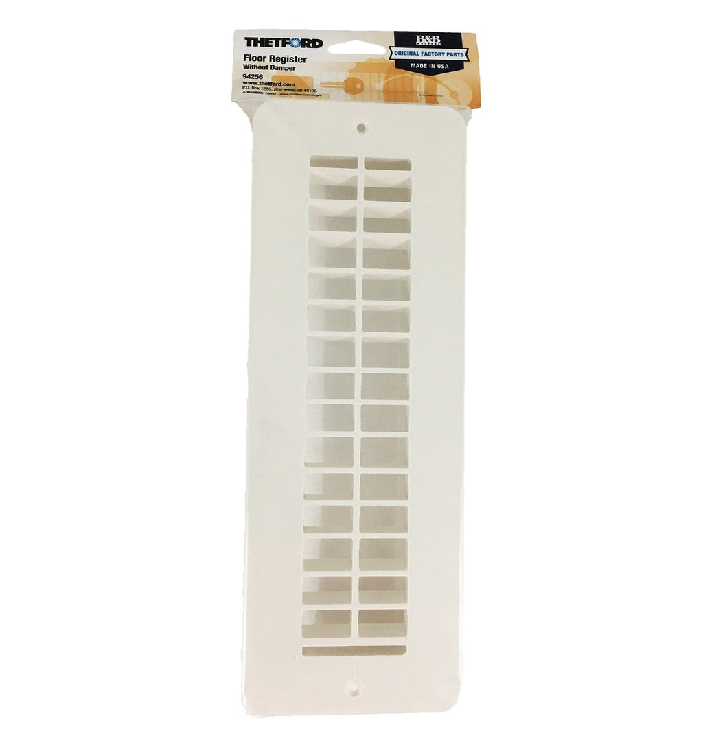 The Thetford BandB Molders 94256, an aftermarket JR Products 288-86-A-PW-A, is an Undampered Polar White Plastic Floor Register.