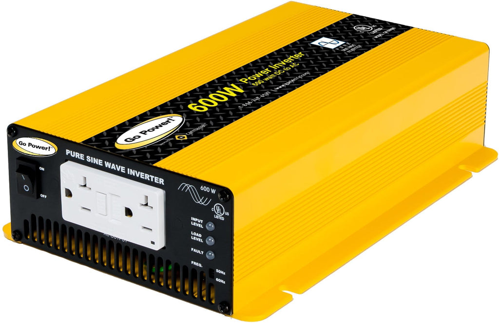 Go Power GP-SW600-12 600 Watt Pure Sine Wave Inverter 12 Volt For slightly larger loads, a GP Sine Wave 600 is perfect. The unit features a compact design and clean quality output. This unit is used in many fleet truck applications. 12 and 24 Volt input available.