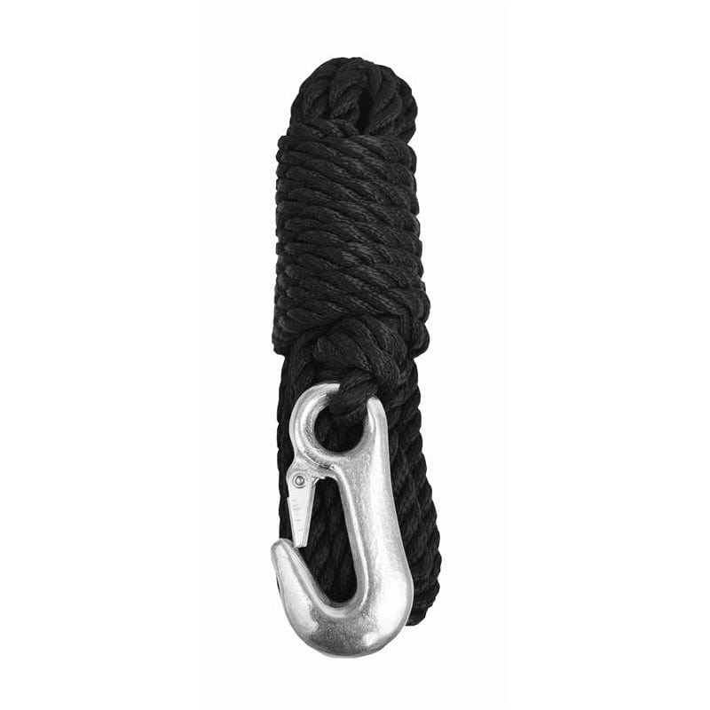 The Attwood 11739-2 is a black winch rope measuring 3/8" x 20' and has a steel hook on one end.
