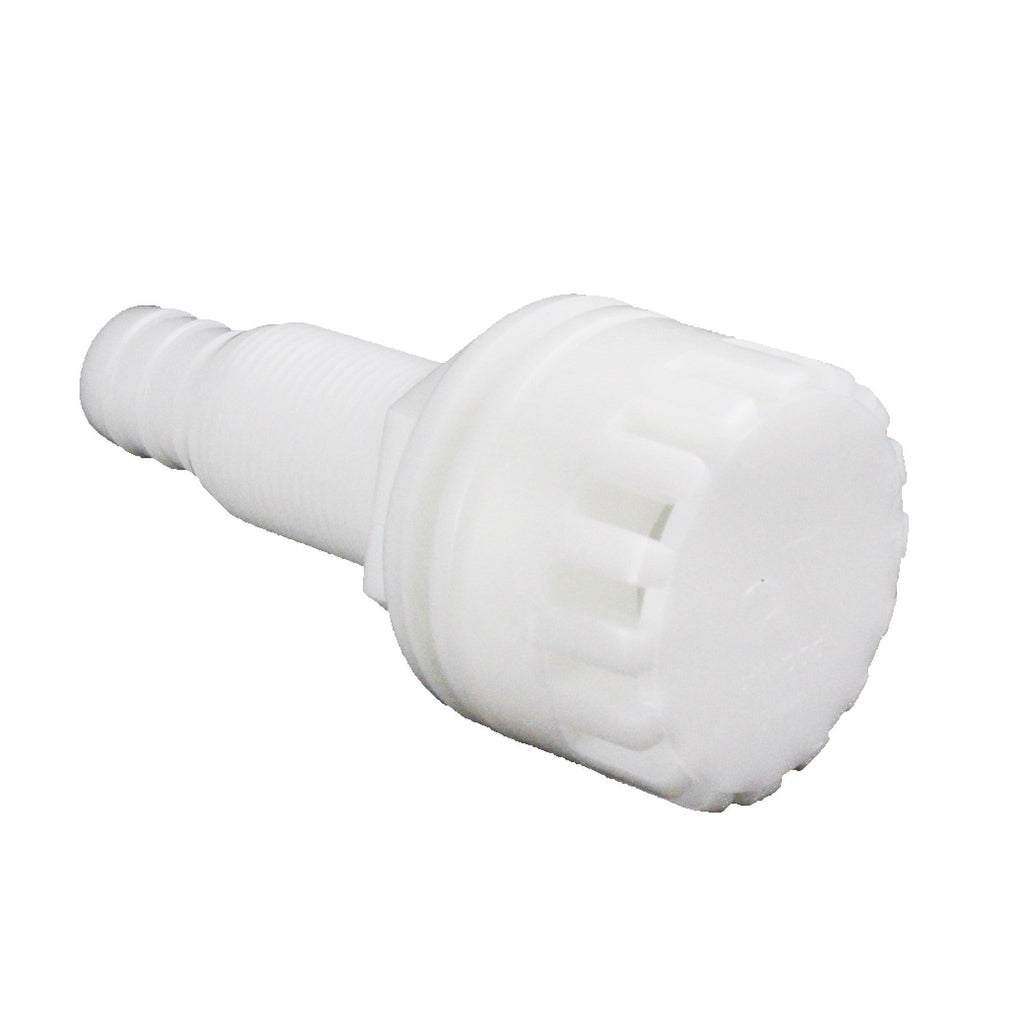 This is a thru-hull connector with strainer which prevents clogging of aerator pumps. The Strainer attaches to threads that extend beyond external retaining nut.