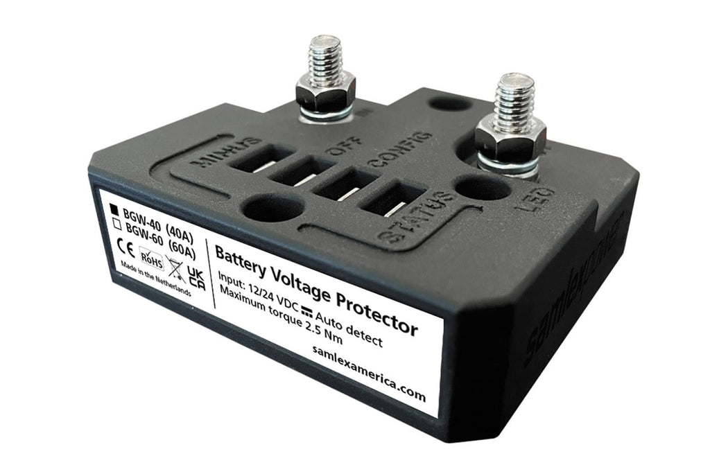 The 40A Battery Voltage Protector BGW-40 is an intelligent, user programmable, fully waterproof low voltage disconnect. The battery voltage protector prevents excessive discharge of the battery (which would damage the battery) and protects electronic appliances against overvoltage. The BGW automatically detects the battery voltage (12 or 24V). The BGW-40 battery guard is capable of carrying 40A continuous load and 45A transient load. There is a choice out of 10 on/off threshold voltage programs, for both 12V and 24V battery systems, which can be easily programmed. The BGW has additional options for a remote off switch and an alarm output for connecting a buzzer, LED strip or relay. With its new rubberized polyurethane construction and low profile design, the battery voltage protector can be easily mounted in any location.