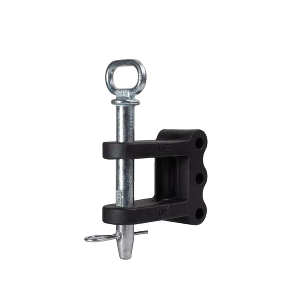 This is a heavy duty 2-tang clevis attachment which features a 1" pin and a 2-3/8" opening. This allows a connection to a Lunette Ring or a farm-style drawbar. It will enable you to tow with farming equipment, pintle trailers, even chains and straps.