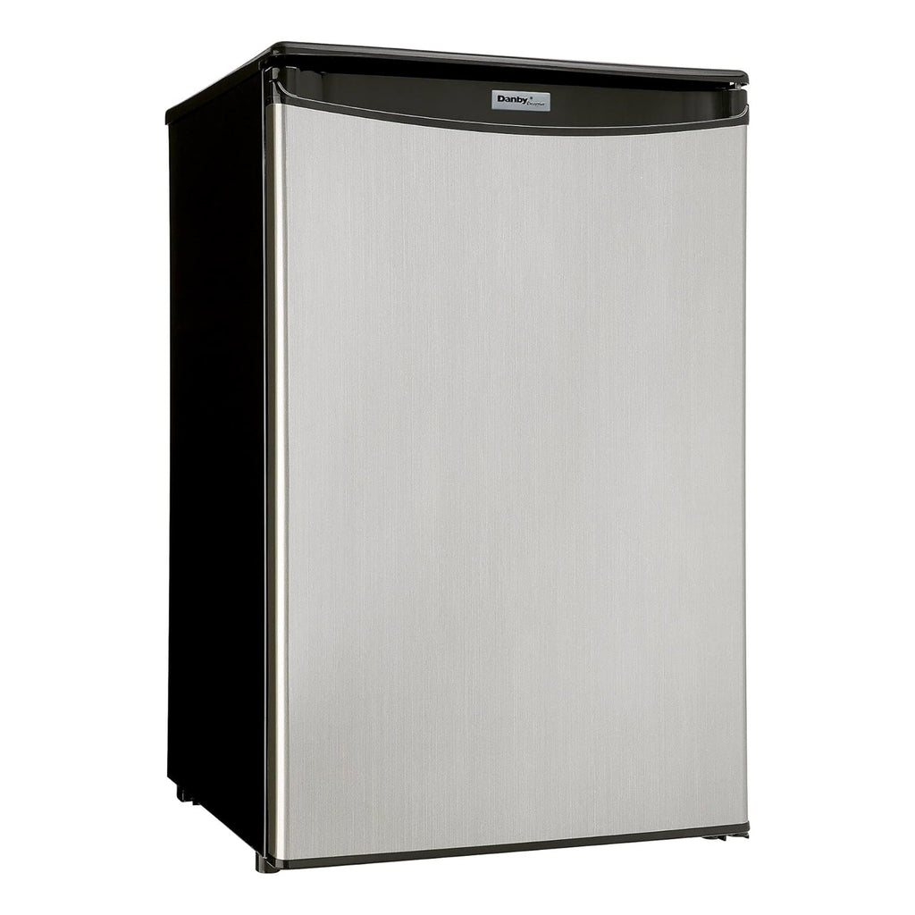 Introducing the Danby 4.4 CF 1-Door All Refrigerator, blending a sleek black cabinet with a spotless steel door for a contemporary aesthetic. Perfect for homes and offices seeking efficiency, this Energy Star certified refrigerator features auto-defrost technology to maintain optimal cooling performance. With a spacious interior design, it offers ample storage capacity, combining style and functionality seamlessly.