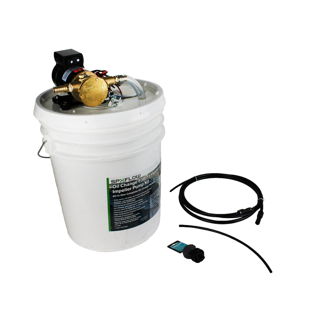 The Johnson Pump 65F3B Oil Change Kit is an all-in-one complete oil change kit that makes oil changes easy and hassle-free. This oil change kit is for marine or industrial applications and features reliable F3B-19 flexible impeller pump technology. The F3B-19 impeller pump has a 5.5 GPM capacity and features a Nitrile impeller that is both serviceable and replaceable. A reversing switch is conveniently built into the pump, allowing for fast fill, transfer, and drain. Also included in this oil change kit is a high temperature-resistant dipstick tube. This dipstick tube allows for immediate, no wait oil change after engine use.