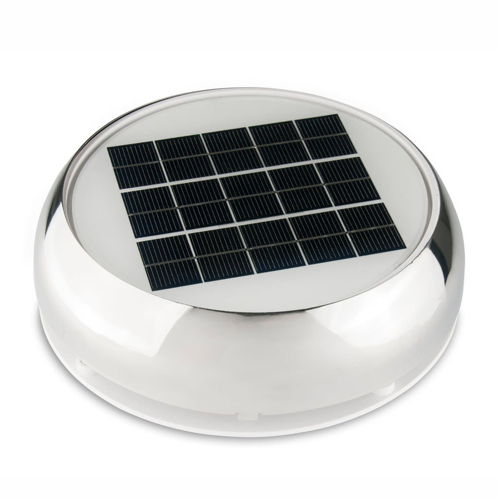 This is a stainless-steel day / night solar vent featuring a new design which threads into the included deck plate and is removable from outside without tools. On/off fan switch, LED lights and intake/exhaust switch accessible from inside the cabin for ease of use.