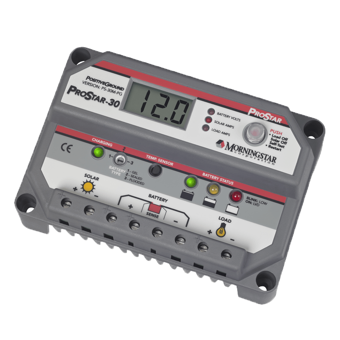 MorningStar ProStar PS-30M-PG 12/24 Volt 30 Amp Positive Ground With Meter Solar Controller. Morningstar's ProStar PS-30M-PG is the world's leading mid-range solar controller for both professional and consumer applications. This second generation ProStar adds new features and protections using highly advanced technology, provides longer battery life and improved system performance, and sets new standards for reliability and self-diagnostics.MorningStar's products are built from the inside out to deliver more than twice the industry average operating life.