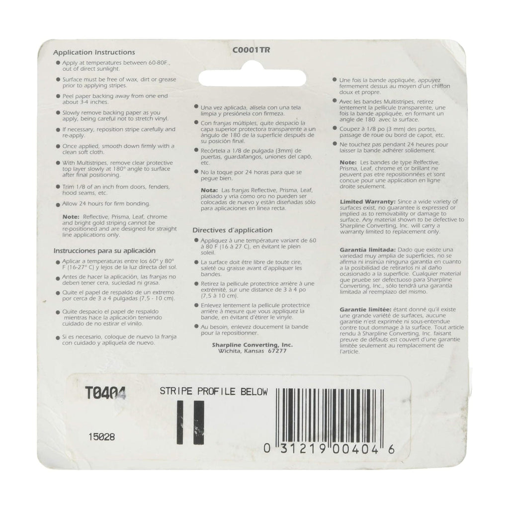 Multistripes pinstriping is 5/16 inches wide and 36 feet long. Surface must be free of wax, dirt, or grease prior to applying stripes. After final positioning remove clear protective top layer slowly at a 180-degree angle for best results.