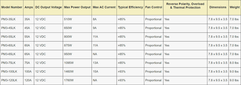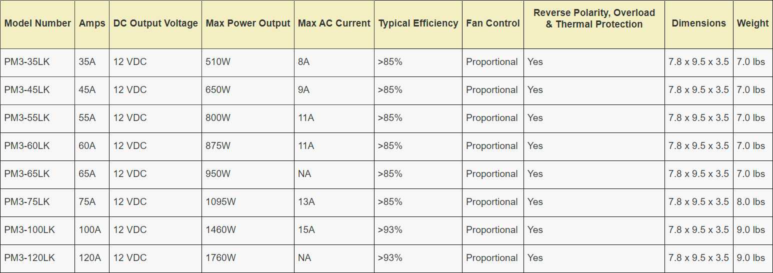 The PowerMax PM3 Series converters 110Vac power to 12Vdc power to charge a battery and/or power 12V equipment. With our state of the art 3 Stage Smart Charging and adjustable power supply modes, the PowerMax AC to DC power converter/battery charger is engineered with the user and variable environmental conditions in mind. They will fully charge and maintain any battery type while providing very clean DC power. Ideal for use in RV, Automotive, Boat, Car Audio, or any applications where battery charging and/or 12V power is needed.