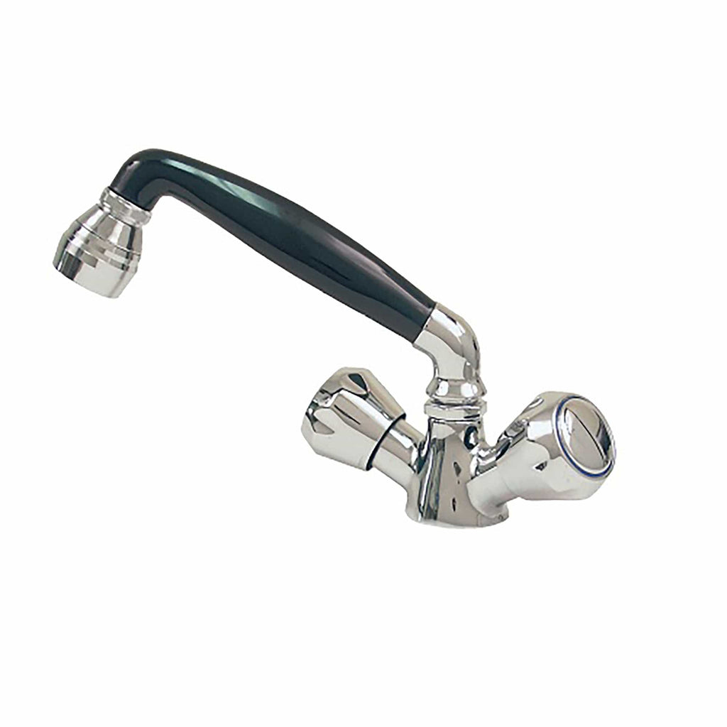 Material: Chrome plated brass faucet body; chrome plated brass knobs; ABS sprayer handle with chromed brass elbow fitting.