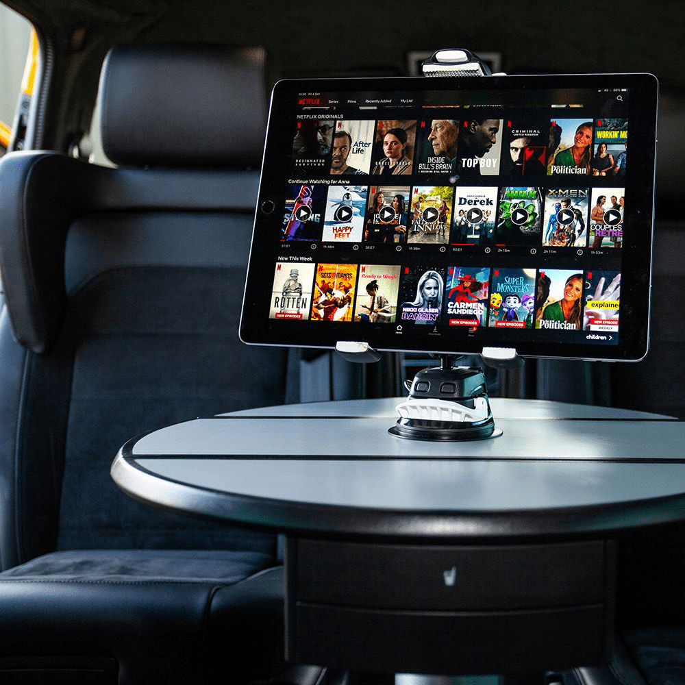 • Secure mount for mini and full-size tablets – ratchet adjustable