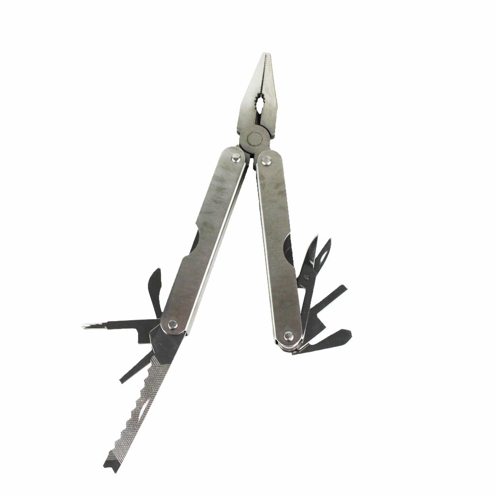 This handy Multi-Tool includes a knife, needle nose pliers, cutters, scissors, various screw drivers, bottle opener, file, and saw. Constructed of corrosion resistant stamped 304 stainless steel. A must have for every tool bag! Includes canvas carrying case.