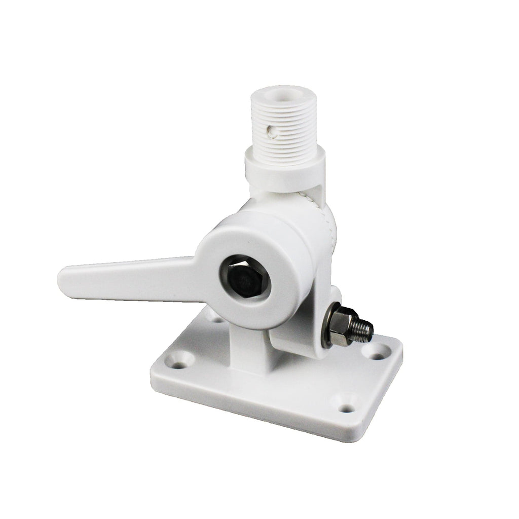 This is a white 4-way ratchet design antenna mount with handle. It is for use on deck or side mounting. It is not for use with antennas longer than 8 ft. in self-supporting mode. It comes pre-assembled.