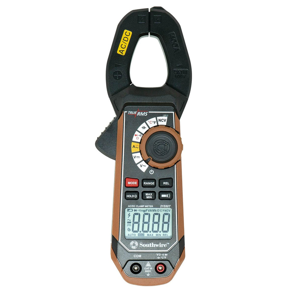 Southwire 2155OT 400A AC/DC Clamp Meter with True RMS, Built-In NCV, Worklight, and Third-Hand Test Probe Holder. Comes with a carrying case, clamp meter, test leads, type K temperature probe with banana plug adapter, AAA batteries and instruction manual