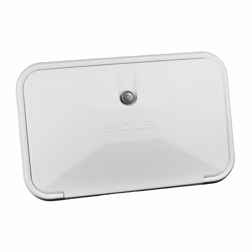 This is an exterior shower with enclosed hatch to prevent water leaks, insects, debris and protects it from the elements.